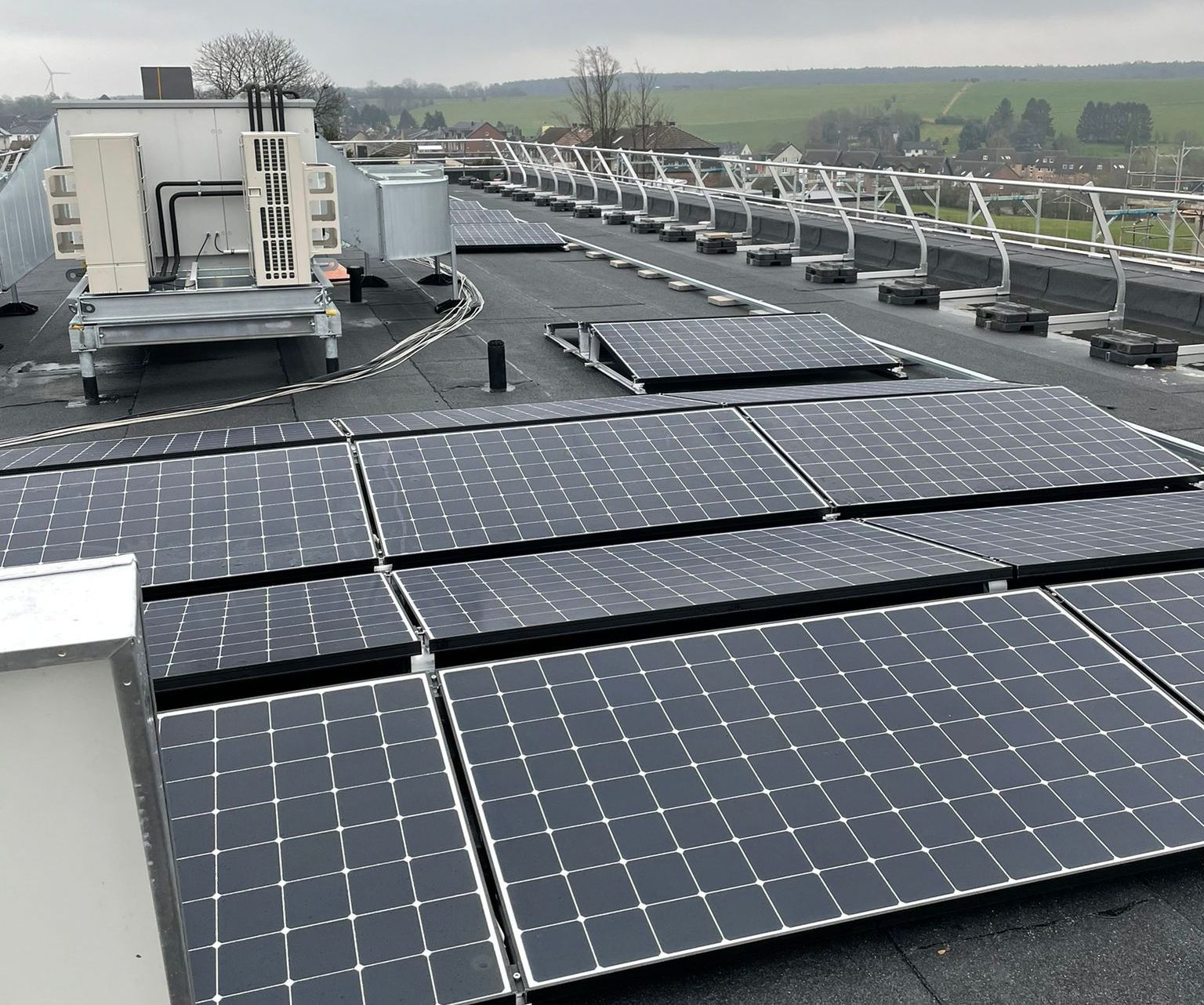 Flachdach der Kindertagesstätte. Die Wechselrichter sollte mit entsprechendem Überspannungsschutz installiert werden. Bedingt durch die Flachdachsituation und die Dachaufbauten anderer Gewerke sollte eine Ost-West-Ausrichtung der Module erfolgen.